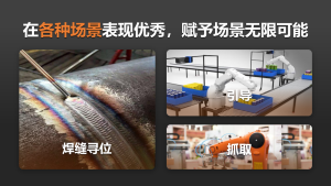 该成像模组是PA视讯国际专为焊接场景设计开发,可内嵌或安装在协作机器人手臂上的轻量化、高性能3D成像模组,基于Ainstec 第二代深度相机架构设计,引领眼上手深度相机的性能革新,为协作机器人赋予强大深度感知能力。超小型3D成像模组,体积小、重量轻,方便安装于机械臂上;采用大功率激光光源,抗环境光干扰能力极强。可广泛适用中、近距离高精度引导、抓取、焊缝寻位等场景。